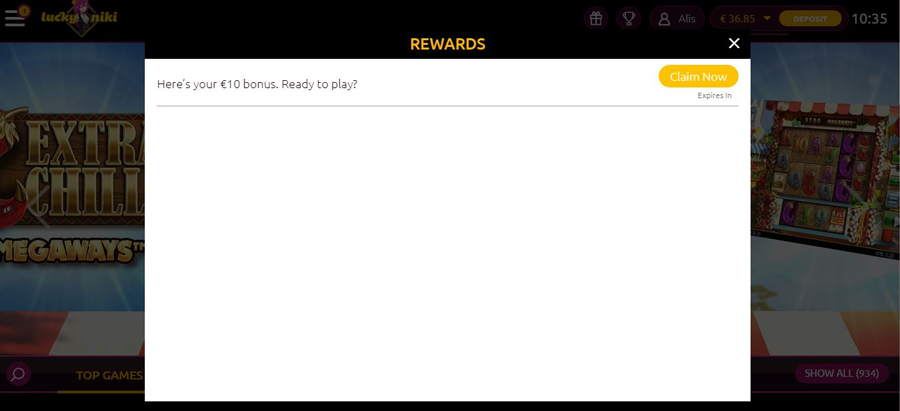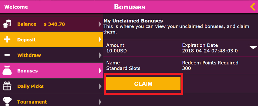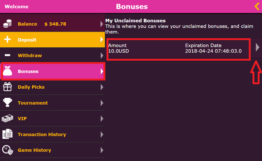 Here is the page where you can find the rewards you have, such as bonus, free spins, cash back. You can claim a bonus from here.