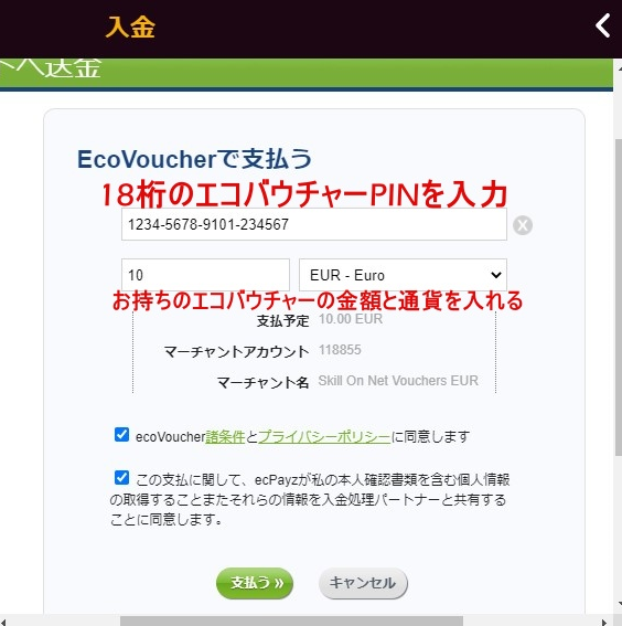 - エコバウチャー送金画面が表示されます。お持ちのエコバウチャーの18桁のエコバウチャーPIN、金額、通貨を入力し、「支払う」ボタンを押してください。